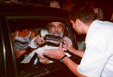 As I saw Vangelis and Montserrat going out through the back door I told my friend: "Let's try to go there too!". Of course it was the artist entrance, but during a moment of inattention we passed through. It was a long corridor and a few people inside. We went out and suddenly a big car stops, just in front of me, a big Mercedes 600, and a very lovely lady seated in the back. I said: "WHOOO! That's a woman!" %-) but what I missed is that Vangelis was seated next to her. At that time a woman went to him asking for an autograph. I said to my self: "let's try it too!" but unfortunately I had nothing to write with. Anyway I asked him in French and he replied to me: "Vous n'avez pas un stylo?" I said "Non!" and he told me "Je suis presse, je dois partir!", I apologized and thanked him for his music. In the meanwhile someone gave me a pen and Vangelis took it to sign me the photo of the program. During this short time my friend asked a photographer to take a picture of us, and he did it.