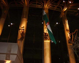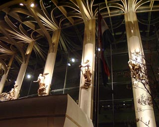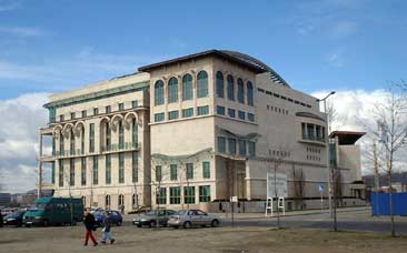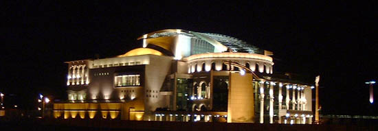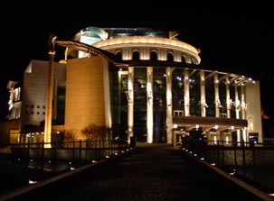 The building appears different from any angle you try, and forms a combination of elegant modern and classical design. The look is dominated by pillars, glass walls and decorations with statues and other unnameable shapes. But when glanced at from another specific angle it seems to portray a ship, sailing on a bridge of water, navigating past a sunken temple to remember the old theater that was demolished so many years ago. It's a delight to wander around the area and explore the park and the building's many faces, before entering the building for the night's performance.