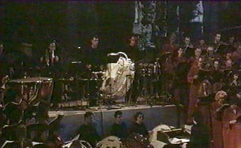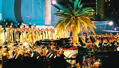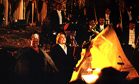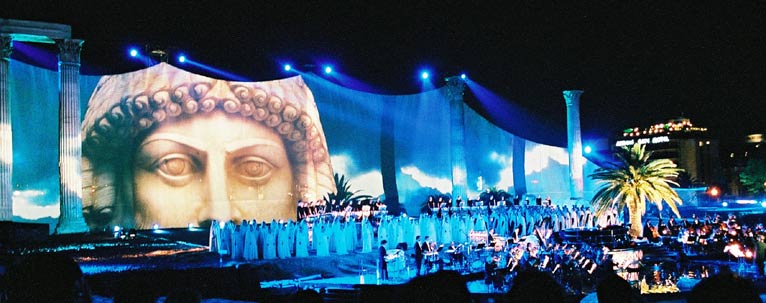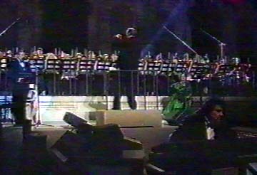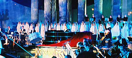 Behind the stage of the concert itself a giant screen was erected behind the temple to allow images and colors to be projected behind the stage that held the choir, timpanists, orchestra, the two soprano's (Kathleen Battle and Jessye Norman) and Vangelis in his centralized synthesizer island.