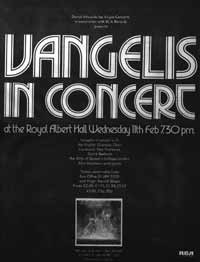 Pictured to the right is an ad for this concert published in British music paper "Sounds" (Feb 7, 1976). The show was staged right after the release of "Heaven and Hell". Vangelis himself said about this concert: