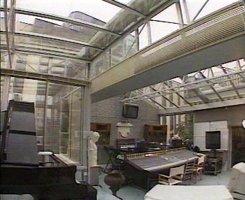 Vangelis' brief early nineties period in Paris resulted in a very remarkable studio environment, most notably because the walls and ceiling where mostly made of glass. In this open environment Vangelis and his team would work during days or nights, being visible from the outside for anyone who cared to take a look. The studio got some exposure because around the initial release of the 1492 soundtrack album several TV interviews were recorded there (including the BBC's "Pebble Mill" and the French "Musiques Au Coeur de Vangelis" interview, while material shot for "Pebble Mill" show was used for more promotional material used internationally) and it appeared in Conquest of Paradise's much broadcast music video clip.