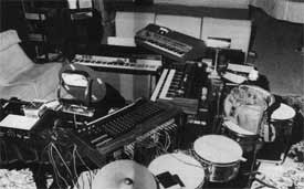Vangelis does not posses a considerable amount of gear. He prefers by far the quality over quantity. Two electric pianos, a Fender 88 and a Yamaha CP80, are enough for him. He still uses the Linn as a percussion synthesizer, as well as lots of toms, futs, cymbals and a Simmons. For Reverb he uses the echoes from the Lexicon 224. Arp and Roland dominate the generation of sequences. A Roland (Vocoder plus 330) is used for processing of voices. As far as synths are concerned the ex Aphrodite's Child is faithful to the Minimoog. In the mean time he acquired an Emulator 6008, a Prophet 10, a Roland JP4, a Trumars Comphonic and, recently, the Yamaha DX7. Nothing was "given" to him, he refuses and prefers to buy his machinery, like everyone, in the stores.