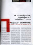 Status Magazine published in its latest issue articles about all those winning their Man of the Year 2002 awards. Two pages have been dedicated to Vangelis: An article by Nikos Mouratidis and a new full size portrait picture of Vangelis. Buy the magazine now, (or try to import it, sometimes local restaurants or Greek shops are willing to help) while you still can!