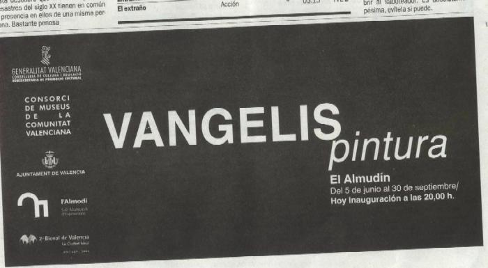 With the paintings exhibition opening tonight at 20:00 at the Almudi in Valencia, publicity in local Spanish news papers is stepping up. Almost all the June 5 publications feature an ad for the event, with some of them writing some advance background information. "Las Provincialas" has a full article with some (older?) interview quotes and a picture of Vangelis among some of his paintings. More news after tonight.