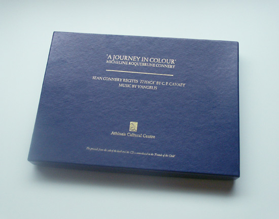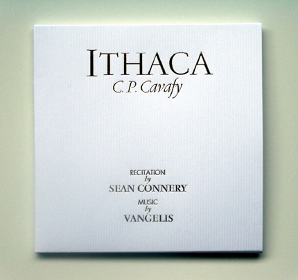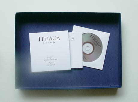 The book consists of 128 pages, showcasing paintings by Micheline Connery, with a preamble, an art critic's interview with Mrs. Connery and the full text of Cavafy's "Ithaca". Not much is clear yet about the CD and the music, except that it's a 4 minutes and 26 seconds recording.