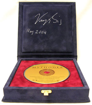 The box in question was made in very limited quantities and was given away only to performers and VIP guests at the 2001 Mythodea concert in Athens. No copies were ever officially sold, making this one of most desirable rarities for Vangelis fans and collectors. These two auctions will provide an absolutely unique chance to obtain this box. For the occasion, Vangelis has personally signed each copy: "Vangelis, May 2004", making them even more unique.