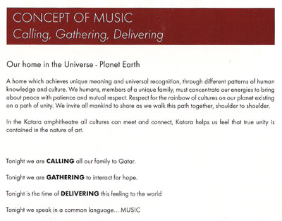 The concert takes place during the fourth annual Forum of the Alliance of Civilizations in Doha. The Alliance of Civilizations (Wikipedia: en.wikipedia.org/wiki/Alliance_of_Civilizations) is a United Nations initiative, launched in 2005, with the aim to "bridge divides and overcome prejudice, misconceptions, misperceptions, and polarization which potentially threaten world peace. The initiative seeks to galvanize international action against extremism through the forging of international, intercultural and interreligious dialogue and cooperation. The Alliance places a particular emphasis on defusing tensions between the Western and Islamic worlds."