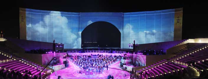 The concert will take place at the recently constructed amphitheater of the Katara Cultural Village in Doha, Qatar's capital city. The cultural village, or "Valley of Cultures" is a project by the Katara Foundation, which "aims to contribute to raise the cultural movement in Qatar and to promote and highlight the creative energies through the management of its different buildings and facilities." The premises houses several theaters, conference halls, exhibition halls, a number of institutes (for film, music, photography, engineering, etc.), restaurants, cafes and a beach. The amphitheater forms the center of the Cultural Village and was build close to the sea. The design of the building is a combination of Roman / Greek and modern Arabic architecture. It fits an audience of 5000 spectators and is considered the largest in the Arabic world.